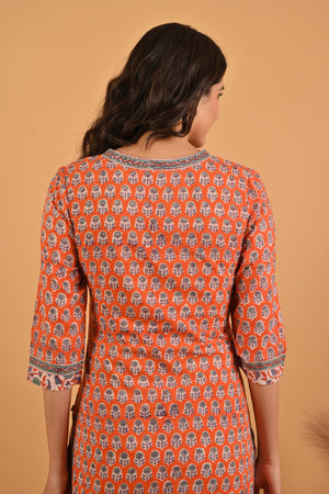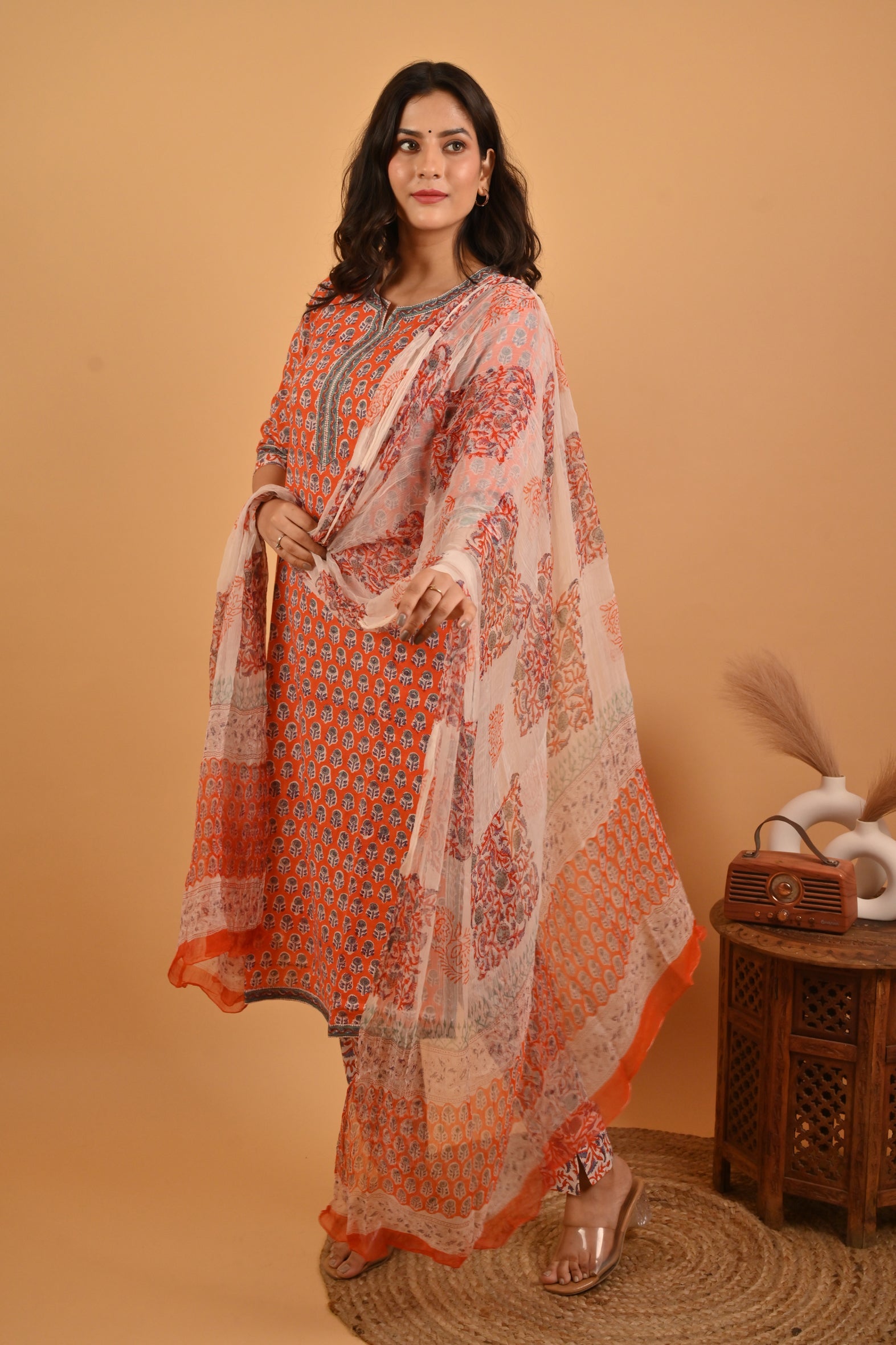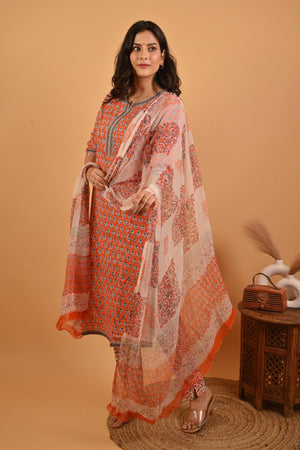 This printed ethnic wear kurta set is presented to you by Gulabchand Prints, A well-known brand in hand block prints from over 9 decades. This exclusively hand stitched kurta set is made of 100% pure cotton fabric with having printed prints over it. The kurta set is best suitable for you to showcase your women hood. Wear this at your ease and the fabric is so smooth to skin that you will love it and the attractive prints adds more charm to the same.